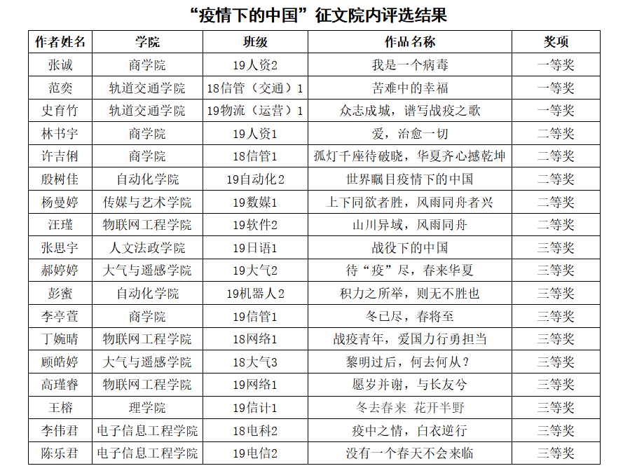 根据《省教育厅办公室关于举办“疫情下的中国”江苏高校大学生征文活动的通知》(苏教办学函〔2020〕8 号),学院近期组织开展了院内评选活动。经广泛征集、各学院推荐、学院集中评审,共评选出一等奖3名,二等奖5名,三等奖10名,现将获奖学生名单公布如下: