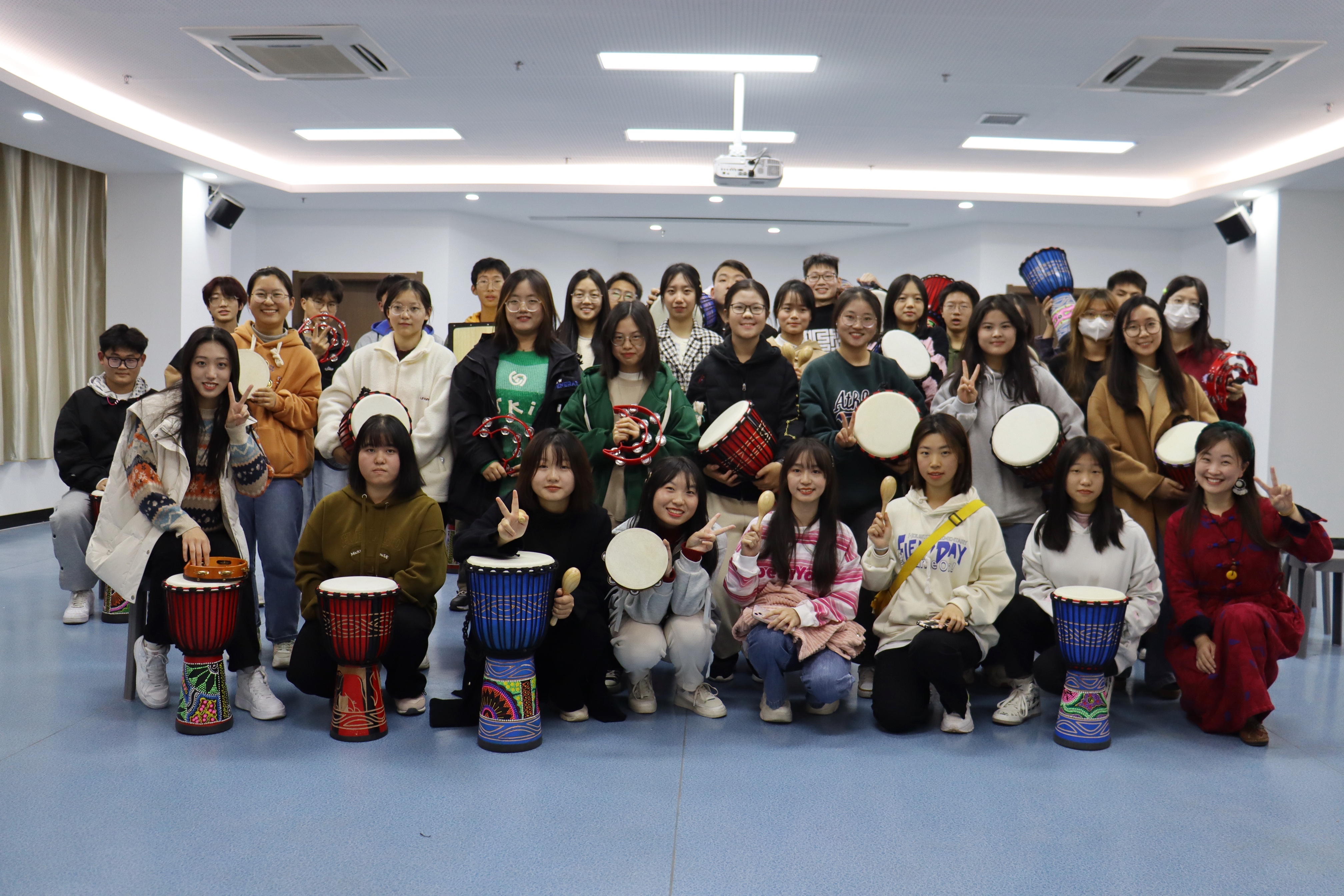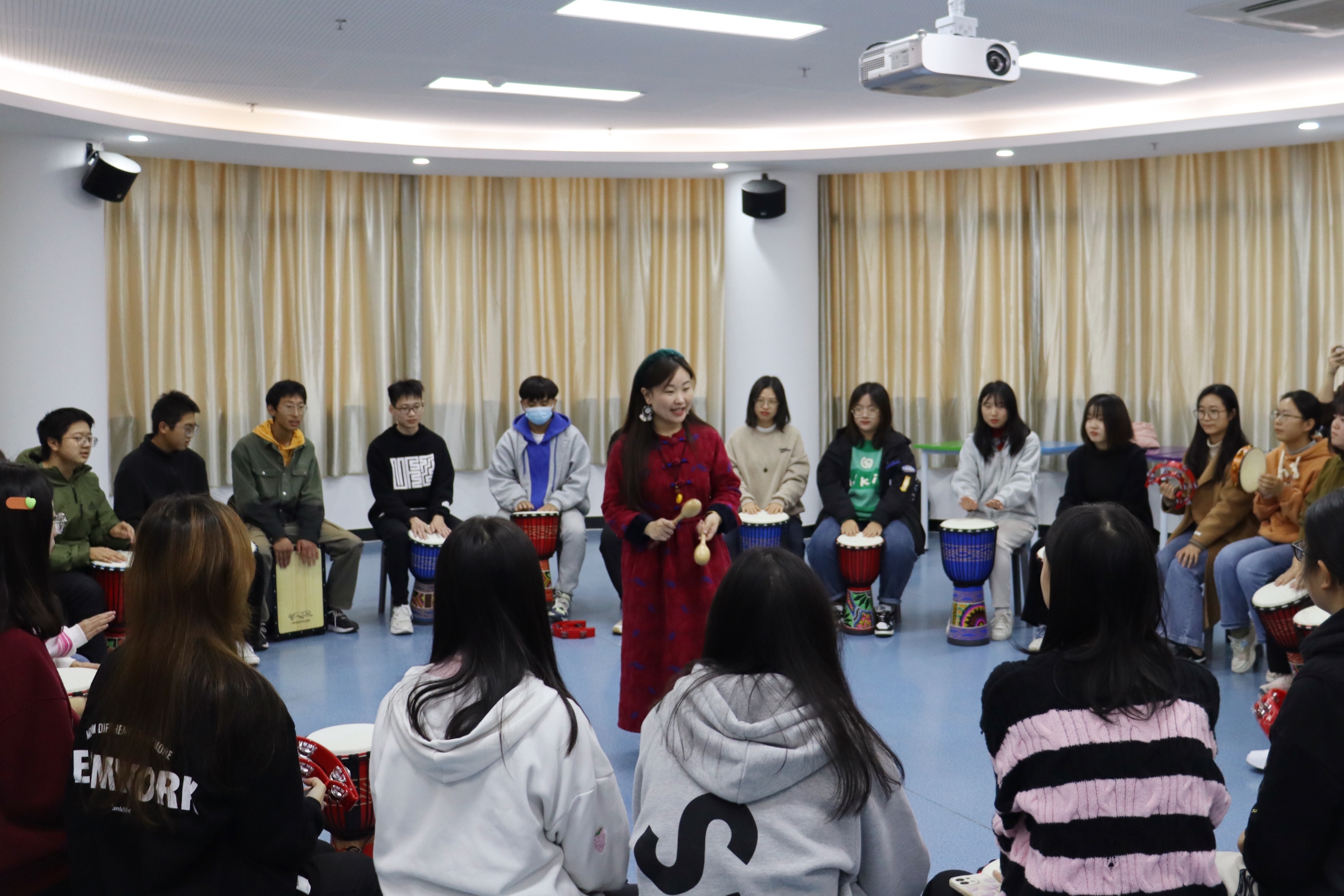 活动伊始,心理健康教育中心吴安莲老师介绍了鼓圈的发源及其作用机制和宗旨原则,并宣读团体契约,创设了安全、尊重、信任的团队氛围。随后通过热身操,使同学们彼此之间建立初步连接。在之后的活动中,大家用音乐、鼓点、节奏对话,充分利用自己的肢体和乐器,通过不同的拍打方式和节奏,共同合奏出美妙的青春之歌。在最后的分享环节,同学们纷纷表示在活动中受益匪浅。