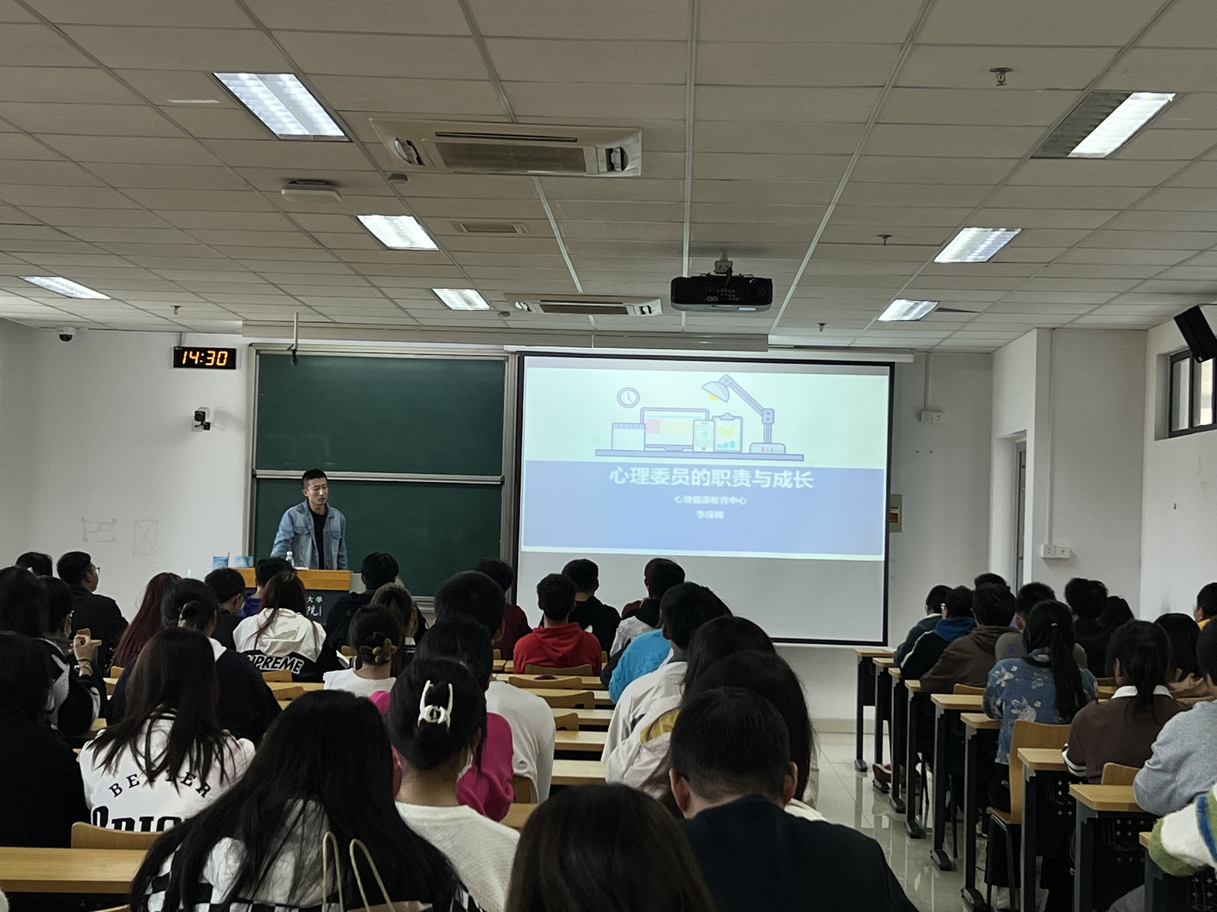培训中,李保辉老师从高校心理健康教育的现状出发,系统阐述了心理委员的角色定位、职责、素质要求和心理辅导的基本技巧。针对当代大学生的心理特点及易出现的心理问题,他用简单易懂的语言和大量的工作案例教授在场心理委员正确有效的心理辅导技巧,希望他们明确自身职责与能力范围,在生活中更好地为同学服务,做出合理的心理疏导。最后,他例举并讲解了班级可以开展的心理活动,并希望全校的心理活动能在心理委员的努力下蓬勃地开展起来。