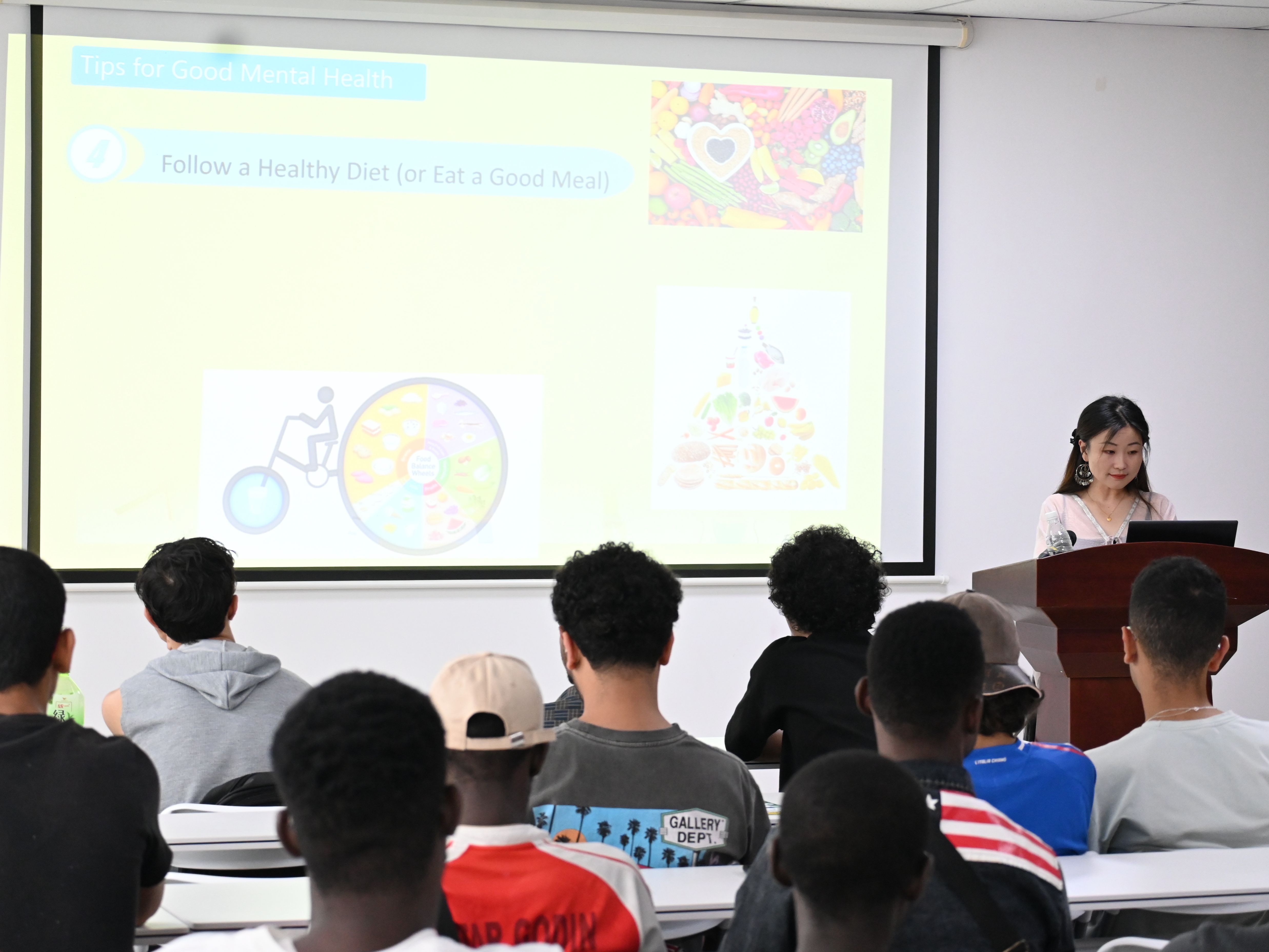 首先,学生工作处吴安莲老师作《心理健康与自我调适》英文讲座,介绍了心理健康的基本知识、留学生常见心理问题、问题表现及如何应对等内容,并现场带领留学生们一起练习腹式呼吸、静坐冥想等心理调节实用技术。讲座结束后,吴老师带领留学生们开展了团体减压活动,用破冰游戏、鼓圈、心理舞蹈、团队游戏等形式,帮助大家在情绪表达、身体舞动和交流互动中获得身心整合与心理调整。