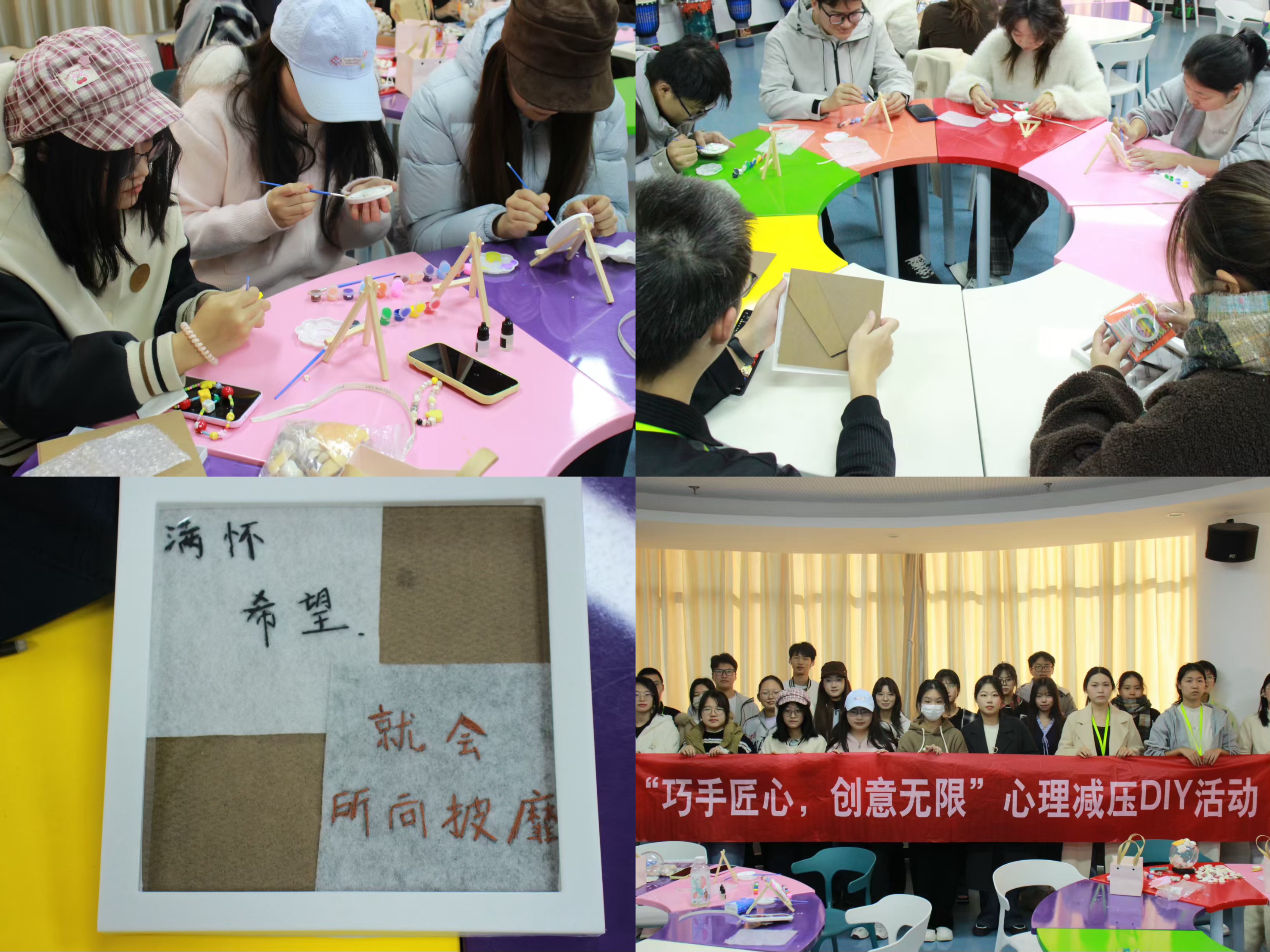 为帮助大学生缓解心理压力,在美育实践中放松身心、感悟自我,11月22日下午,学生工作处在学生活动中心团体活动室成功举办“巧手匠心,创意无限”心理减压手作工坊,共三十余名同学参与活动。