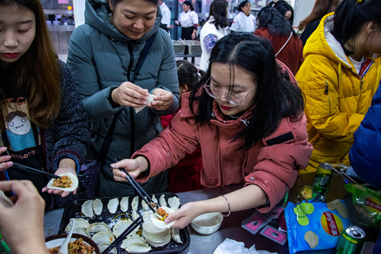 饺子陆续上桌后,同学们开心地吃着蘸有各地特色蘸料的饺子,纷纷表示这是今年吃的最香、最有意义的饺子!