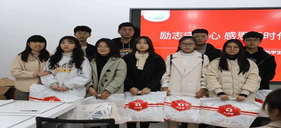 朱菊香老师代表学院向在场受助学生发放慰问品,她同时希望学生不忘国家和学校的温暖,努力求学,懂得感恩。