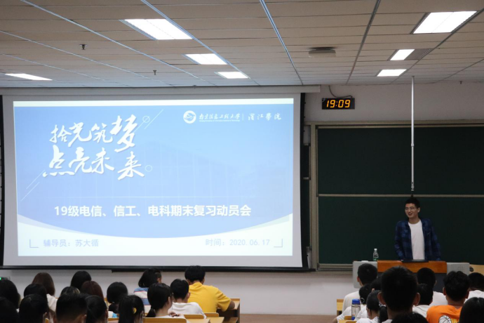 为加强2019级学风建设,强化学生管理,提醒督促2019级学生积极复习迎考,提升学习效果,考出理想成绩,严肃考风考纪,6月17日晚,电信院在勤学楼101召开了2019级期末复习暨诚信考试纪律动员会。2019级辅导员以及全体新生参加了动员大会,会议由辅导员苏大循老师主持。