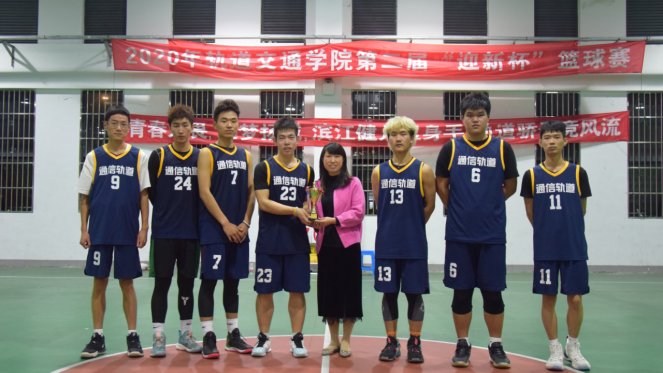 轨道交通学院副院长朱菊香老师为本次“迎新杯”篮球赛冠军球队19级通信(轨道)篮球队颁发象征着最高荣誉的冠军奖杯。由学院仇维斌,姚召华老师分别为本届亚军及季军颁发奖杯。