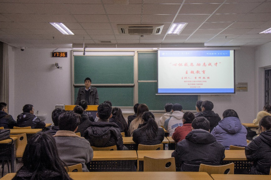为宣传国家学生资助政策,引导家庭经济困难学生用好奖助学金,有效发挥优秀学生典型的示范引领作用,激励学生奋发自强、励志成才、感恩奉献,12月16日下午,电子信息工程学院于思泉楼106开展了“心怀感恩,励志成才”主题教育活动。此次活动由电信院副院长李晖教授主讲,辅导员曹琳主持。学院全体辅导员、2020级家庭经济困难学生、2019级和2018级优秀学生代表参加此次活动。