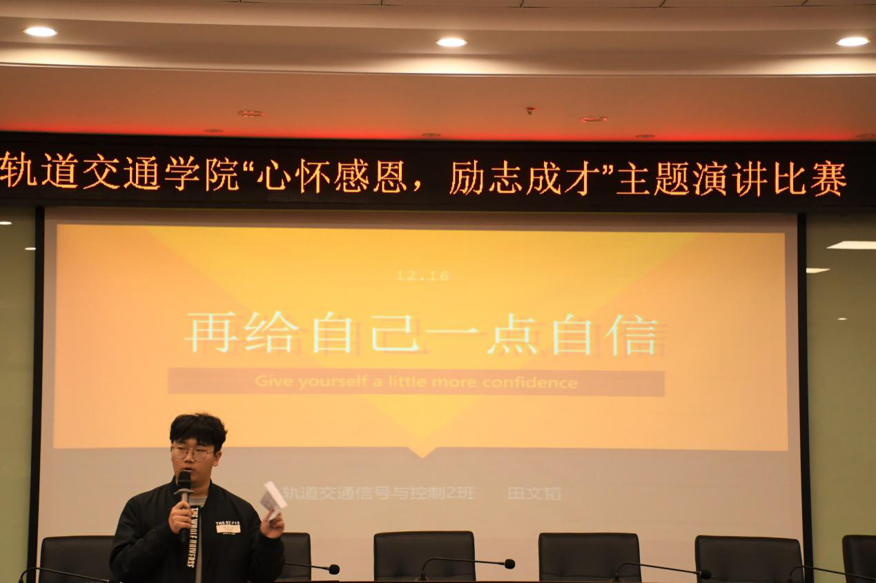 12月16日,轨道交通学院在行政楼121会议室举办“心怀感恩 励志成才”主题演讲比赛。活动由李佳熙老师主持。郜云波老师、刘永星老师、姚召华老师,院办卫威老师及学院辅导员等担任活动评委。
