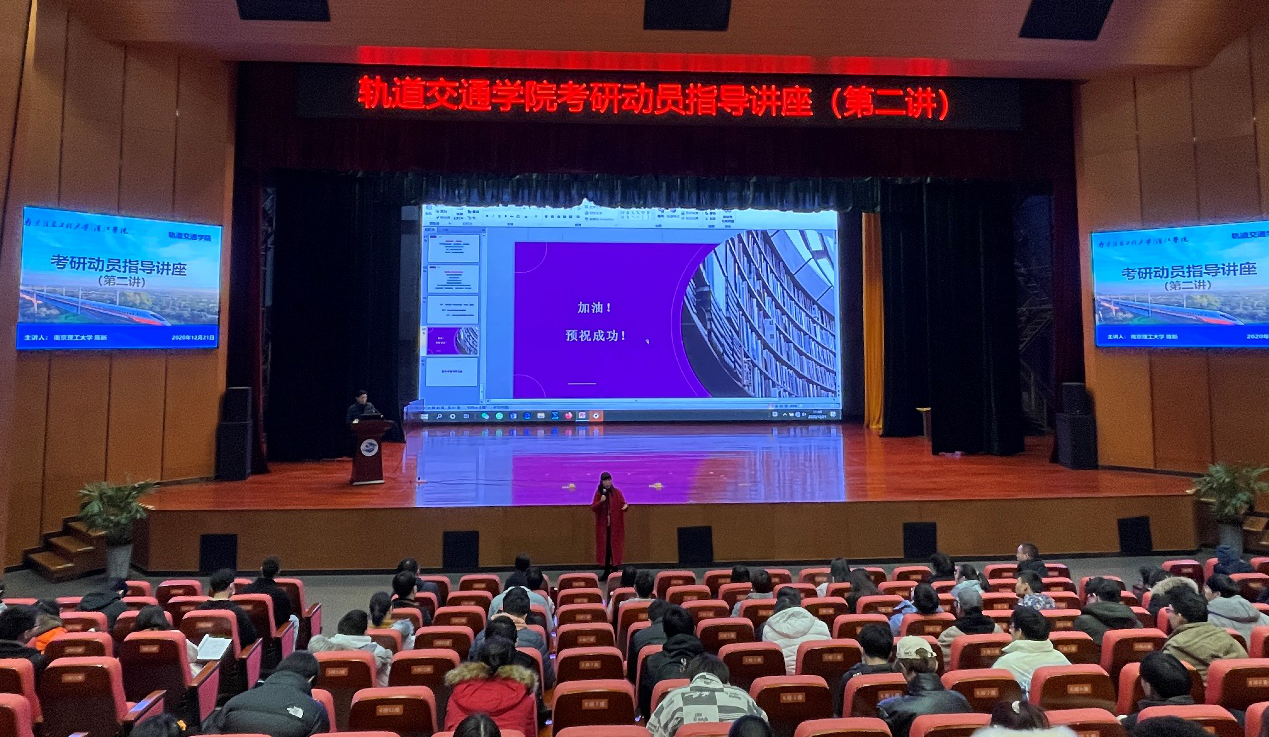 为进一步调动学生考研积极性,帮助2018级学生正确认识考研意义、明确考研目标,轨道交通学院于12月21日上午在滨江大礼堂二楼报告厅举办考研动员指导讲座。讲座特邀南京理工大学陈新教授担任主讲人,我院党委副书记、副院长张灿龙,保卫处处长、轨道交通学院党总支书记朱广革,轨道交通学院副院长朱菊香及轨道交通学院2018级本科生参加讲座。
