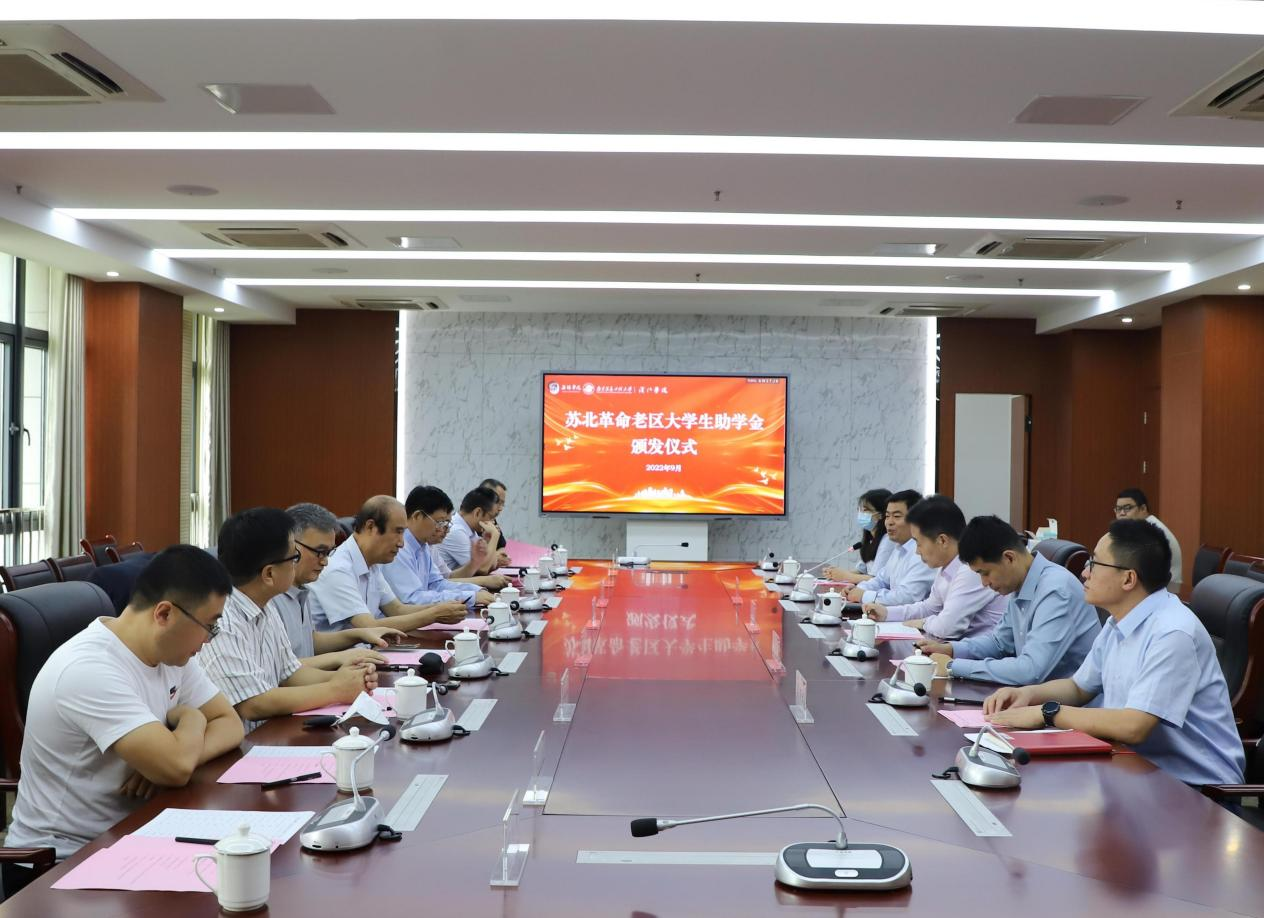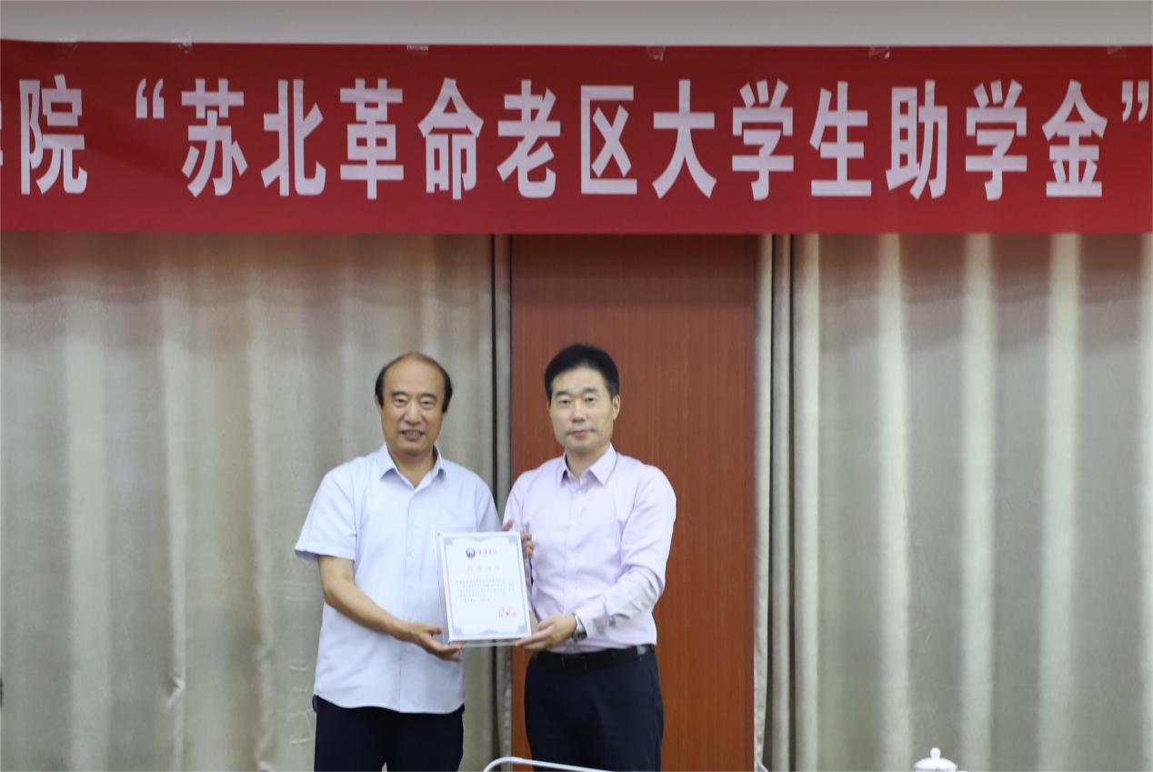 9月15日上午,2021-2022学年“苏北革命老区大学生助学金”颁发仪式在我校举行。无锡市人民政府原副市长吴建选,无锡市人民政府原副秘书长唐余开,无锡市民政局二级巡视员、原党委书记、局长葛恒显,无锡市市政公用产业集团董事局原主席薛少成,无锡市广播电视集团原党委书记、总裁郭王,无锡商业大厦集团党委书记、无锡商业大厦大东方股份有限公司原常务副总经理张胜铭,无锡尚城上品装饰设计工程有限公司总经理陆宗强,无锡支持苏北革命老区发展研究会秘书长、无锡市政协委员傅昌,研究会秘书处办公室主任柯越根,无锡学院党委书记杨建新,相关职能部门负责人,以及部分学生代表出席仪式。