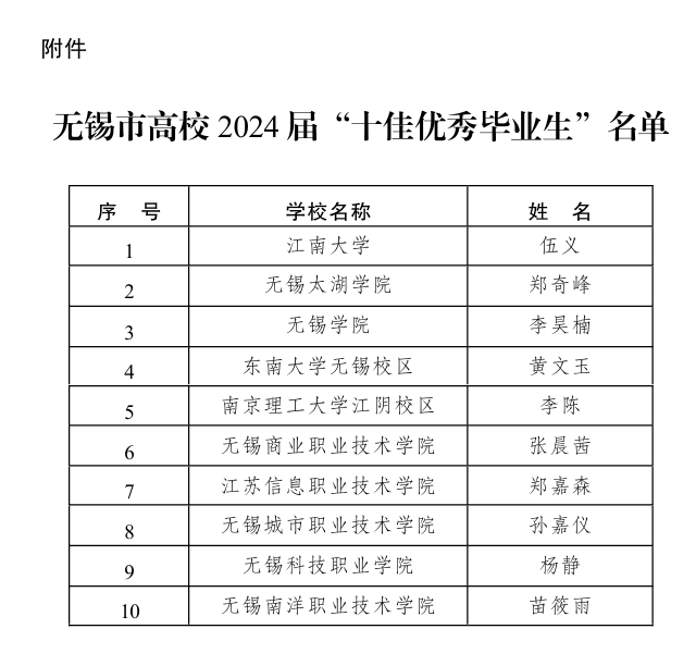 无锡市高校2024届“十佳优秀毕业生”评选由市教育局、团市委联合组织开展,江南大学、无锡学院、东南大学无锡校区等10余所在锡高校参加评选。