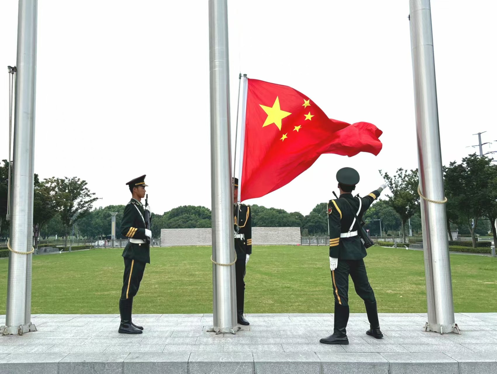 晨曦微露、红日初升。护旗方队列队集合,指挥员的口令响起,护旗方队步伐铿锵有力,向升旗台前进。他们身着礼服,手持步枪,步伐铿锵有力,眼神坚定而自豪,每一个步伐、每一个动作都力求精准无误。升旗台下,护旗方队队员目光如炬,面向国旗肃立。“向国旗敬礼!”7点整,扬旗手振臂扬起国旗,《义勇军进行曲》响彻广场,鲜艳的五星红旗在晨风中展开,伴随着激昂的旋律缓缓升起。全体观礼成员坚定注视着国旗冉冉升至旗杆顶端,礼毕,升旗仪式正式结束。
