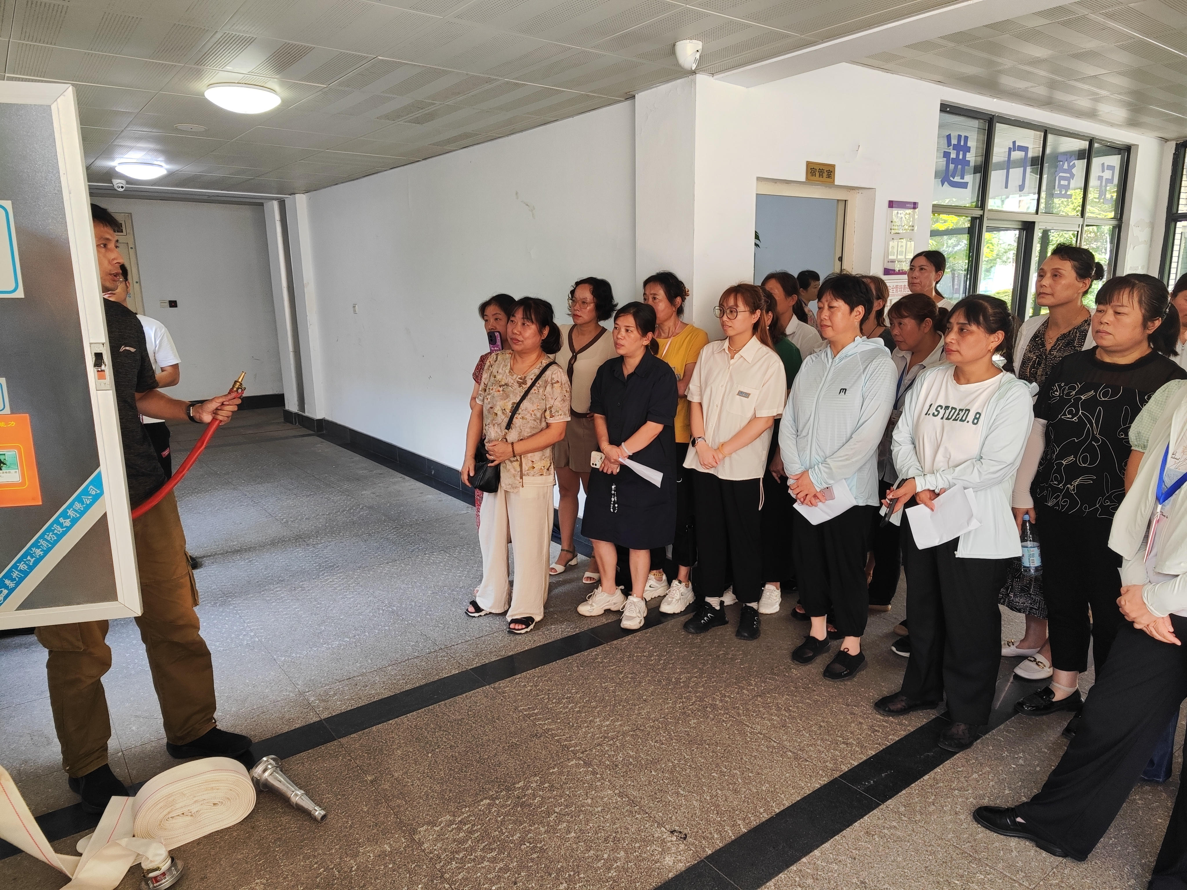 为提升宿管员消防应急能力,保卫处邀请了无锡市消防协会消防培训专家对全体宿管人员进行了消防应急逃生和消防设施实操培训。培训专家详细讲解了消防逃生知识技巧,强调遇到火灾或者突发情况一定要保持冷静、有序疏散,并第一时间向保卫处报告。会后,专家还带领宿管人员到学生宿舍,现场演示了干粉灭火器、二氧化碳灭火器等不同类型的灭火器的操作方法,以及如何快速连接水带、水枪,打开水阀进行灭火的基本步骤。