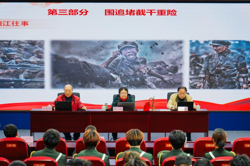 宣讲现场,三位老首长以《披荆斩棘长征路——红军之后话红军》为题,结合父辈投身革命的亲身经历,用翔实的史料、鲜活的故事和真挚的情感,带领在场学生重温了红军长征那段波澜壮阔的峥嵘岁月。他们重点讲述了长征途中红军面临的极端险恶自然环境、白热化的敌我斗争以及濒临极限的生存考验,从“险恶曲折道路难”“路线斗争生死战”“围追堵截千重险”“缺衣少粮渡饥寒”“雪山草地鬼门关”五个篇章,生动还原了红军将士在绝境中坚守信仰、向死而生的英雄壮举,深刻诠释了坚韧不拔、百折不挠的长征精神。真挚的讲述深深打动了在场每一位听众,让大家在回望历史中深切感悟到革命先辈的初心使命与精神力量。