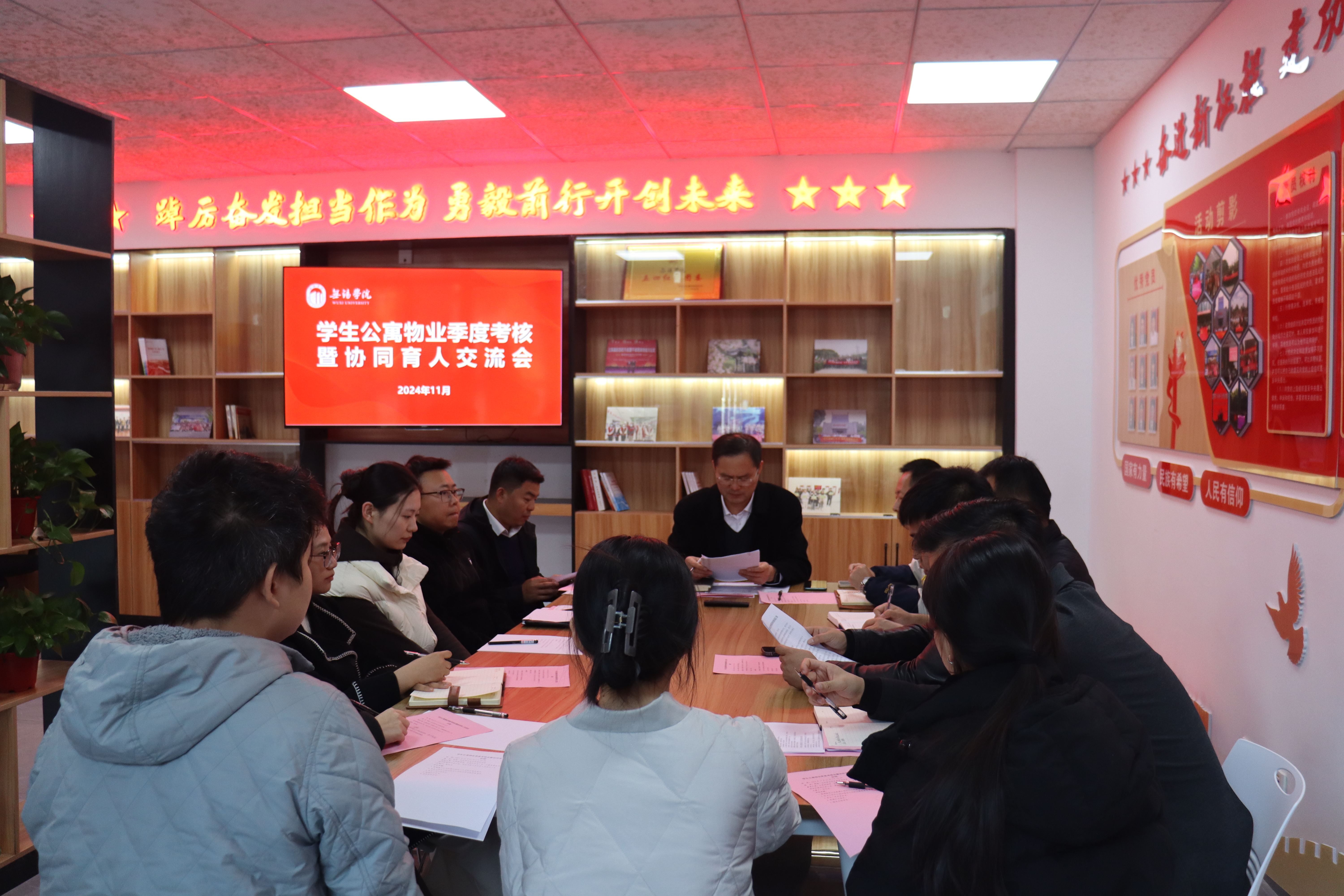 为加强学校学生公寓管理工作,进一步推动三全育人工作落细落实,11月27日下午,我校在梅园“一站式”学生社区召开学生公寓物业季度考核暨协同育人交流会,校党委常委、副校长左同宇,纪委办、学生工作处、后勤管理处工作人员、教师代表、学生代表及物业公司代表参加会议。